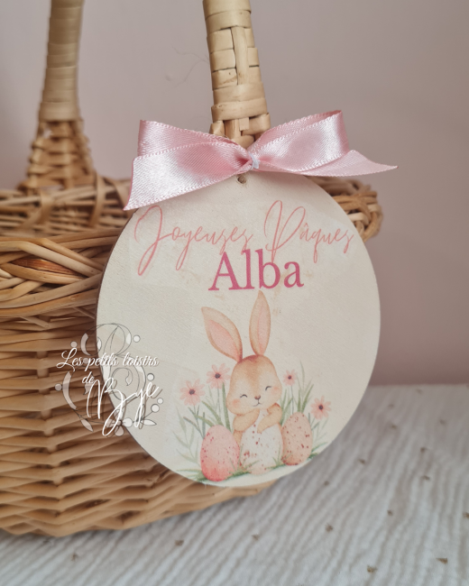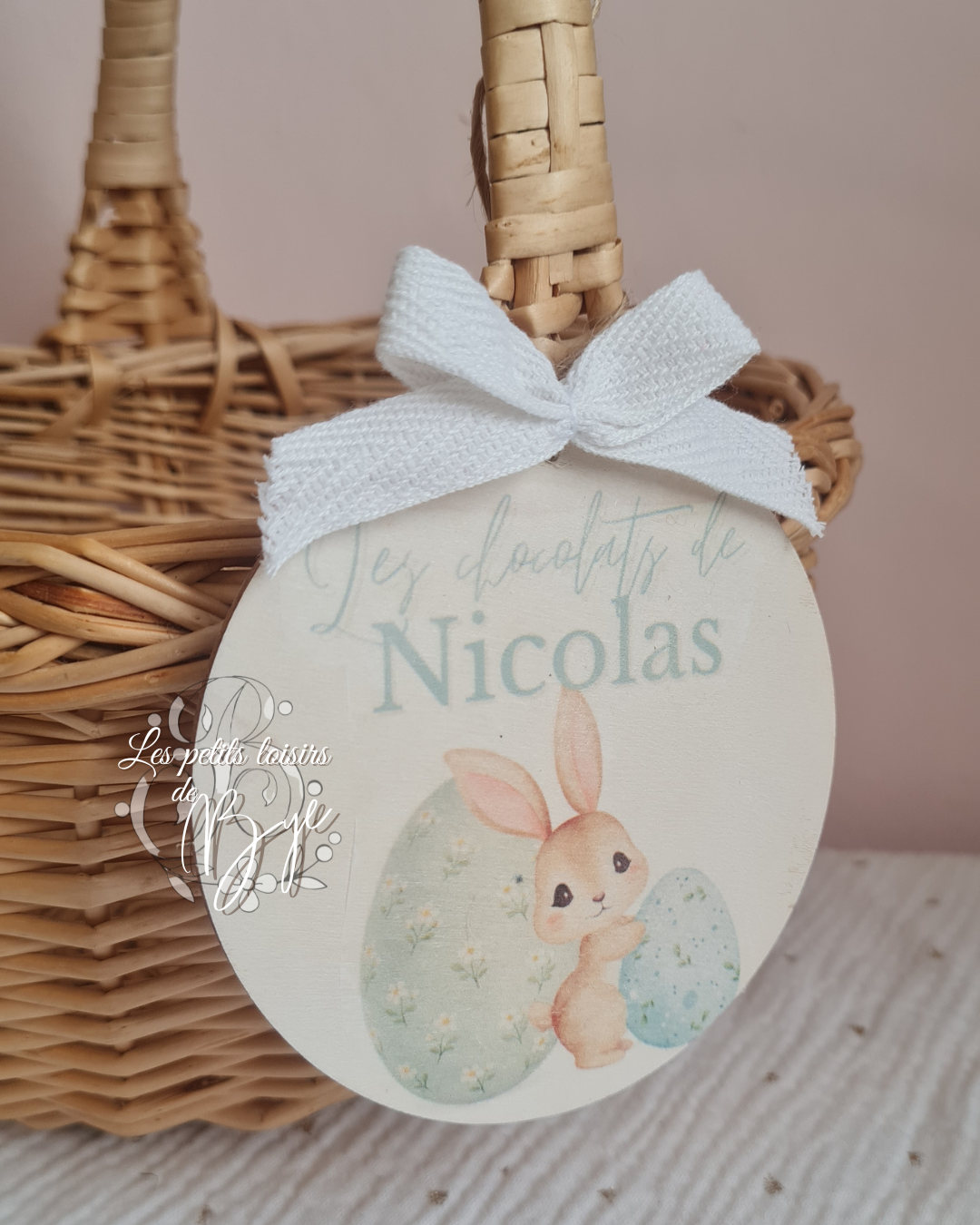 Plaque en bois personnalisable, accompagnée d’un joli nœud et d’une ficelle au dos pour l’accrocher facilement.